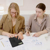 With a 65mm wide writing board and a pen for taking notes while doing calculations. You can delete the notes by pressing the delete key or lock them to keep them.