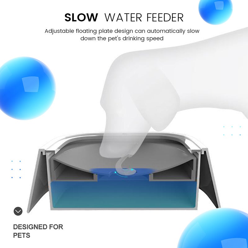 Slow water feeder: The adjustable floating plate design can automatically slow down the pet's drinking speed. When your pet’s tongue touches the floating disc, it will sink and water will flow out of the hole. -